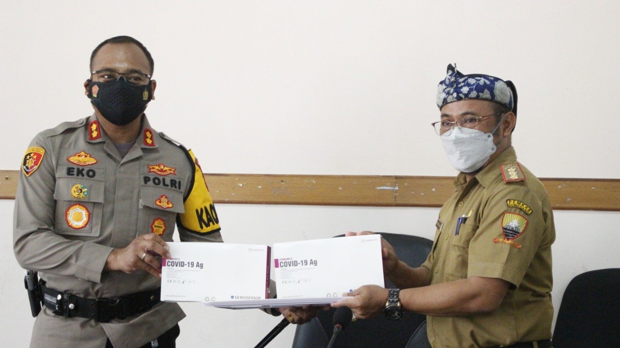 Adapun bantuan yang disalurkan, sambung Kapolres, yaitu 50 set Alat Rapid Test Antigen Covid-19, Masker, Handsanitizer dan Handskun.