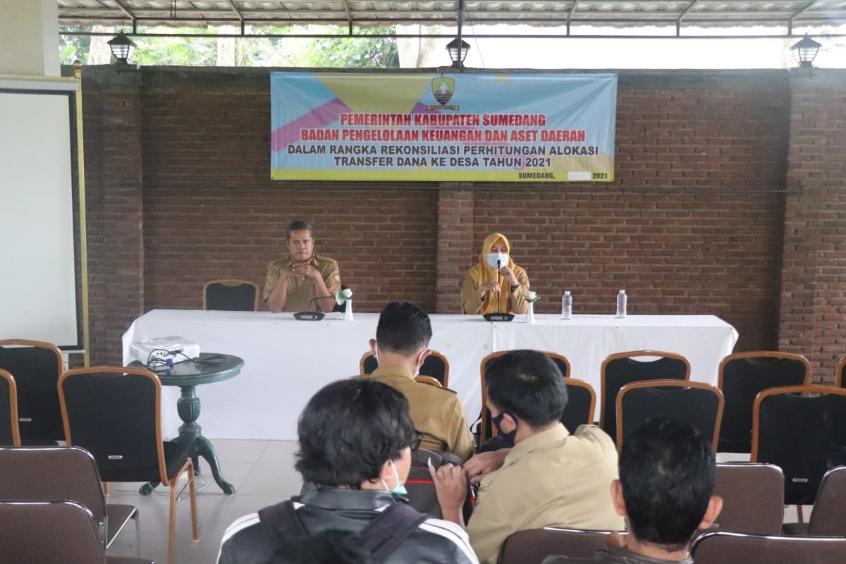 Sumedang, KORSUM – Antisipasi kesalahan dalam perhitungan, khususnya terkait ADD, BPJS dan Penghasilan Tetap (Siltap) Perangkat Desa, Badan Pengelolaan Keuangan dan Aset (BPKA) Kabupaten Sumedang melaksanakan Sosialisasi dalam rangka Rekonsiliasi Perhitungan Alokasi Transfer Dana ke Desa Tahun 2021 di Sapphire City Park. Senin (5/4/2021).