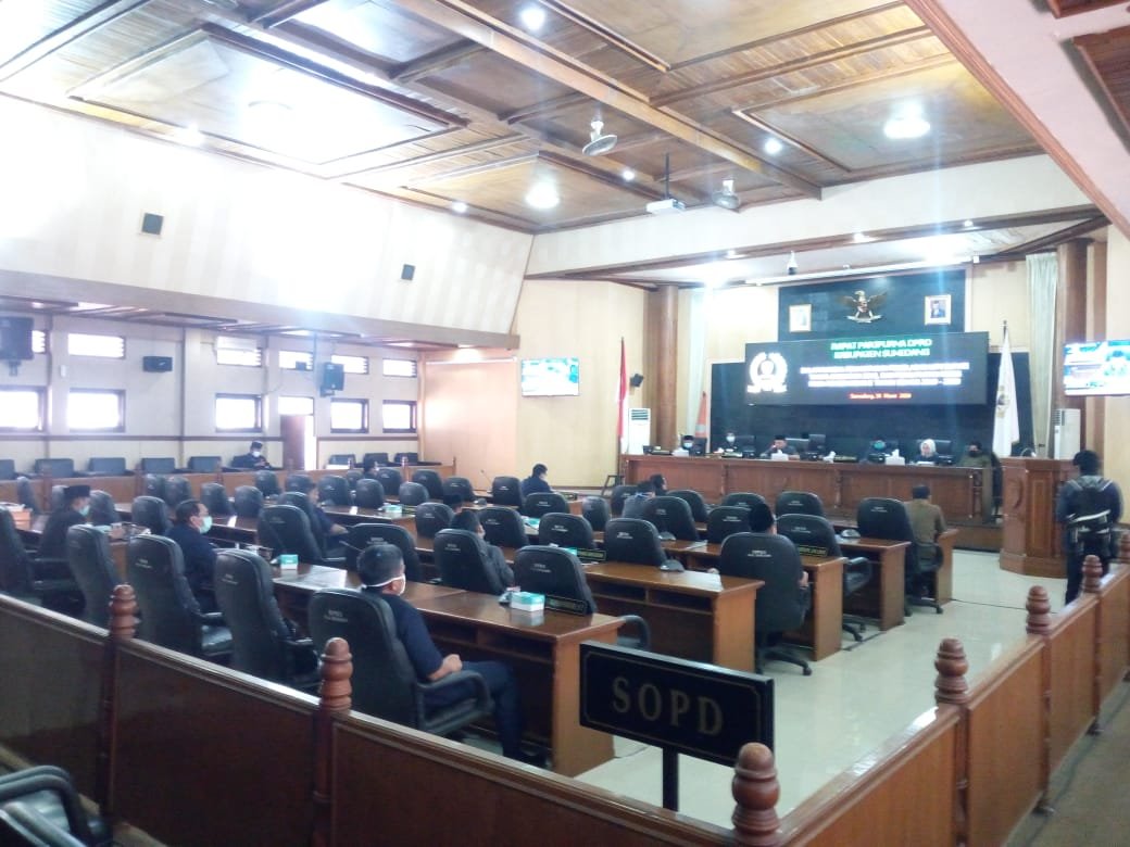 Ketua DPRD Kabupaten Sumedang, Irwansyah Putra mengatakan, Rapat Paripurna ini tetap kita laksanakan ditengah mewabahnya Covid-19. Hanya saja berhubungan dengan adanya larangan tidak diperbolehkan adanya perkumpulan massa. Sehingga pada Rapat Paripurna ini, anggota DPRD Sumedang yang hadir dibatasi hanya beberapa orang saja.