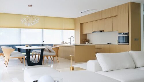 Ruang tamu dan dapur dirancang dengan konsep ruang terbuka dan palet warna senada. Menghadirkan kesederhanaan dalam desain bukanlah hal mudah. Insignio Studio menggunakan desain dengan satu tone warna. Tidak seperti yang dipikirkan orang banyak, mendesain rumah dengan satu tone warna menuntut ketelitian tinggi. Untuk tetap memastikan desain yang dihadirkan akan tetap eksklusif, Insignio memilih material berkualitas agar keseluruhan rumah tetap tampil eksklusif dan berkarakter.