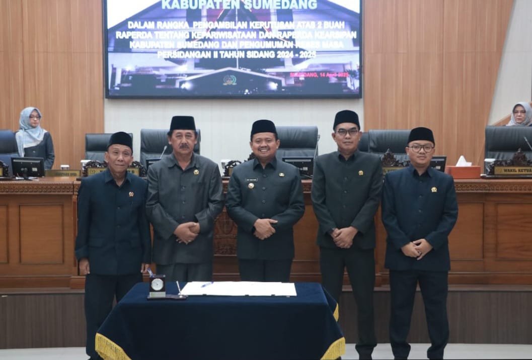 SUMEDANG, 14 April 2025 — DPRD Kabupaten Sumedang mengesahkan dua Rancangan Peraturan Daerah tentang Kepariwisataan dan Raperda tentang Kearsipan menjadi Peraturan Daerah.