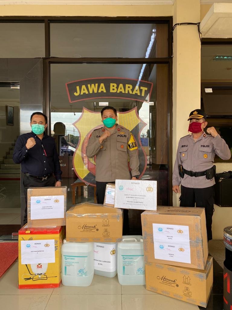 Sumedang, KORSUM – Sebagai bentuk dukungan terhadap Polres Sumedang yang menjadi ujung tombak dilapangan dan berhadapan langsung dengan masyarakat dalam penanganan Covid-19. PT. Sagara Purnama dan Marwah Skin Clinic memberikan donasi berupa Alat Pelindung Diri (APD), Cairan Desinfektan dan alat penyemprotannya, Masker, Sarung Tangan, dan Hand Sanitizer.