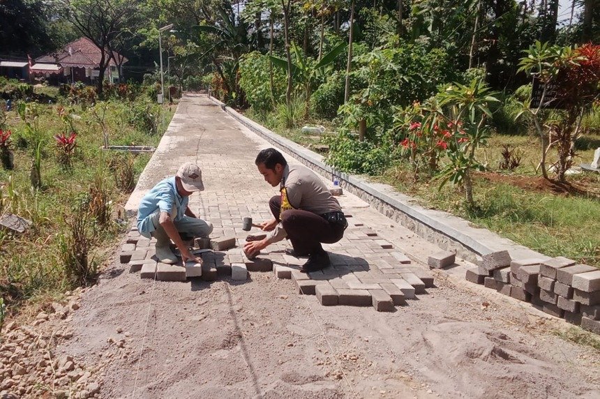 Dalam kegiatannya Bhabinkamtibmas Bripka Irpan Sopian memberikan himbauan dan memperbaiki jalan desa.