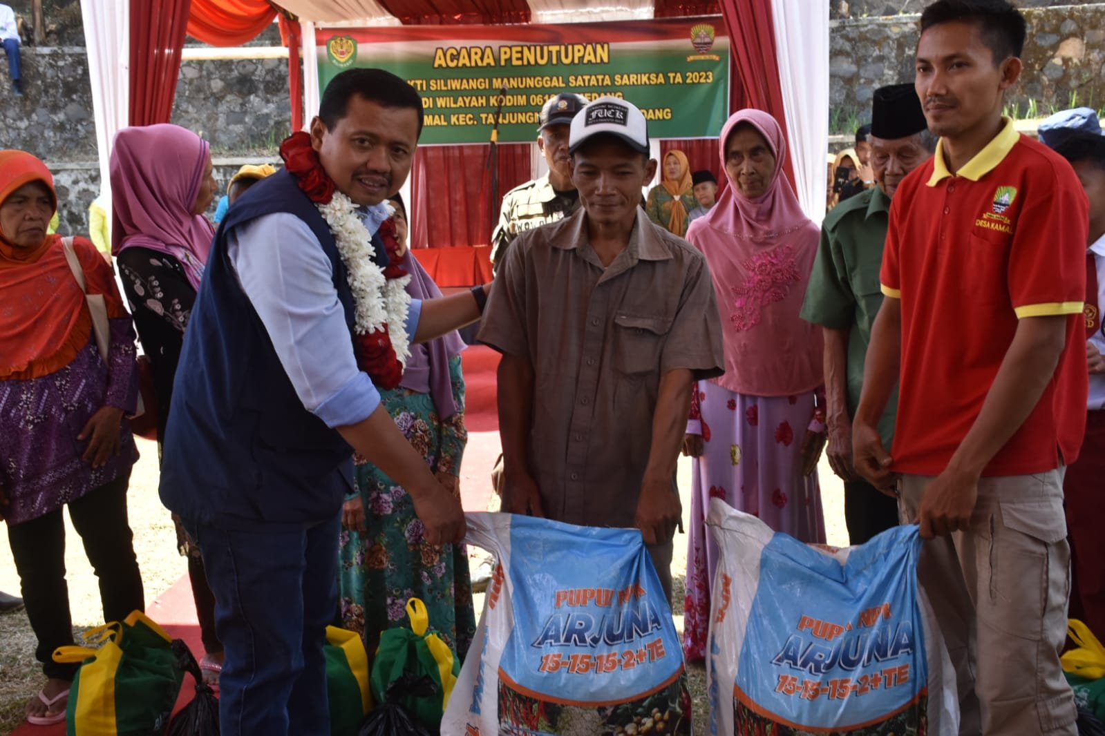 Di penghujung acara Bupati H Dony Ahmad Munir beserta Dandim 0610 Letkol Kav Christian Gordon Rambu, M.Si., (Han)., dan unsur Forkopimda lainnya membagukan bantuan Sembako dan pupuk pertanian kepada warga.