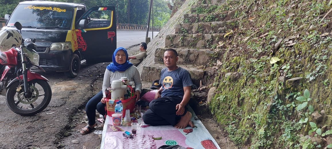 Pasutri 3 anak ini bercerita kisah hidupnya bertahun-tahun bergantung di Cadas Pangeran yaitu mengais rezeki jualan kopi seduh dengan menggelar sehelai tikar di pinggir ruas jalan tersebut hanya bermodal 200 ribu rupiah.