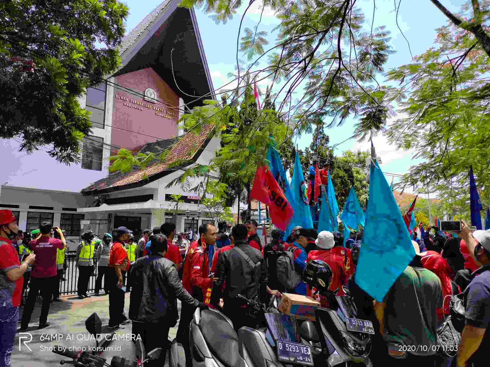 Sumedang, KORSUM – Minta Omnibus Law Undang-undang Cipta Kerja dibatalkan, ratusan buruh yang tergabung dalam organisasi buruh seperti SPSI, PPB – KASBI, GOBSI, PEPPSI-KSN Kab. Sumedang melakukan Unjuk Rasa (Unras) di Gedung DPRD Kabupaten Sumedang, Rabu (7/10).