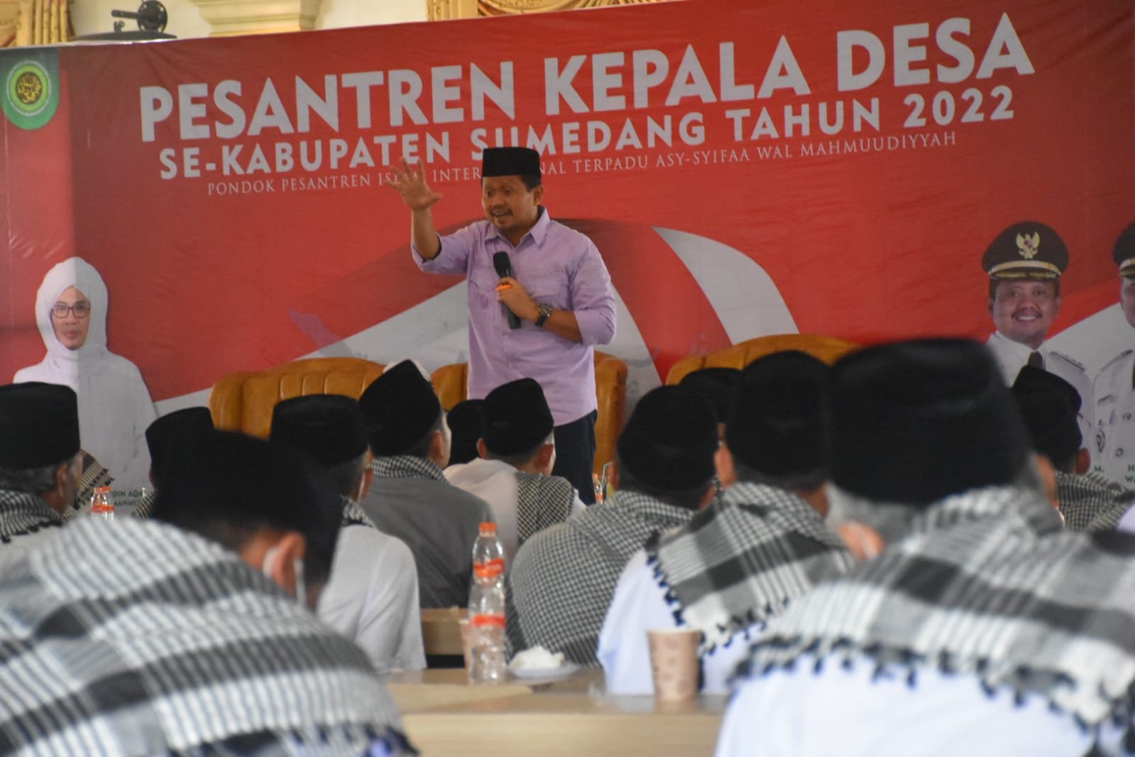 Demikian kata Bupati Sumedang H Dony Ahmad Munir usai memberikan materi pada kegiatan Pesantren Kilat Aparatur Kepala Desa se-Kabupaten Sumedang Gelombang I di Pondok Pesantren Internasional Asy-Syifaa Wal Mahmudiyyah, Pamulihan, Selasa (22/3/2022).