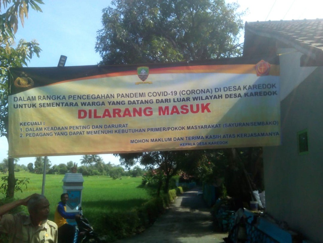 “Spanduk bertuliskan larangan bagi pendatang atau tamu dari luar kota memasuki Desa Karedok demi menghindari penyebaran Covid-19 kecuali dalam keadaan penting dan darurat serta pedagang yang dapat memenuhi kebutuhan primer.” Kata Kades Karedok Intab Wikarya melalui telepon selulernya.