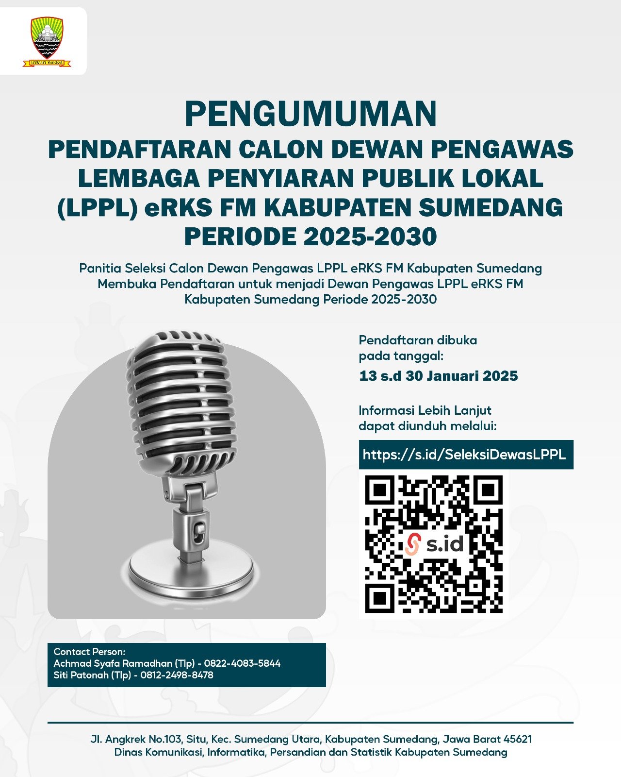 Pemerintah Kabupaten Sumedang kembali membuka kesempatan bagi masyarakat luas untuk menjadi bagian dari Dewan Pengawas Lembaga Penyiaran Publik Lokal (LPPL) ERKS FM periode 2025-2030.