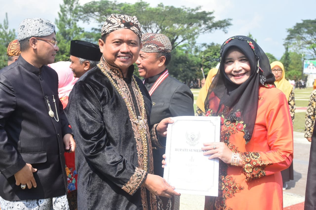 Dengan didampingi Wakil Bupati Sumedang H. Erwan Setiawan dan unsur Forkopimda, Bupati Dony secara simbolis menandatangani lima buah prasasti proyek pembangunan di akhir upacara yakni renovasi Gedung Labkesda BSL-2, pembangunan Gedung GOW, penataan Gedung Budaya Geoteather, Revitalisasi Gedung SD Karapyak dan Revitalisasi Gedung SMP Negeri 1 Sukasari.
