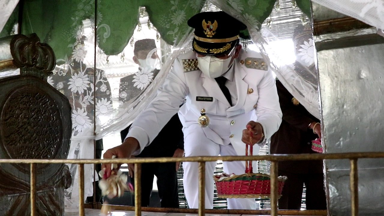 Sumedang, KORSUM – Dalam rangka memperingati Hari Jadi ke-443 Sumedang, Wakil Bupati H. Erwan Setiawan didampingi Istri beserta unsur Forkopimda dan beberapa Kepala Perangkat Daerah melakukan ziarah ke makam leluhur Sumedang yakni Pangeran Soeria Koesoemah Adinata (Pangeran Sugih) di Gunung Puyuh Desa Sukajaya Kecamatan Sumedang Selatan, Senin (19/4/2021) pagi.
