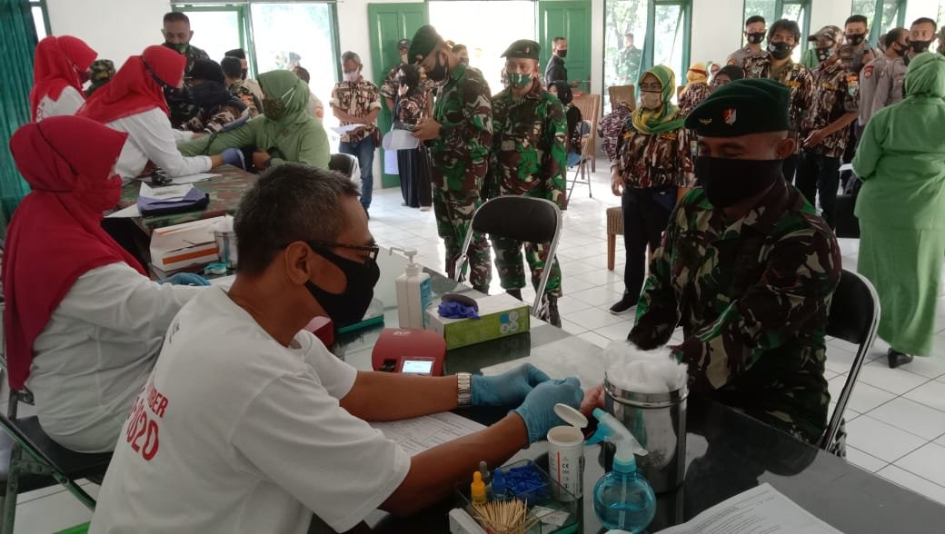 Sumedang, KORSUM – Dalam rangka memperingati HUT ke-75 TNI Tahun 2020, puluhan prajurit Yonif R 301/Prabu Kiansantang mengikuti Bhakti Sosial Donor Darah di Gedung Juang Apet Makodim 0610/Sumedang, Kamis (17/9).