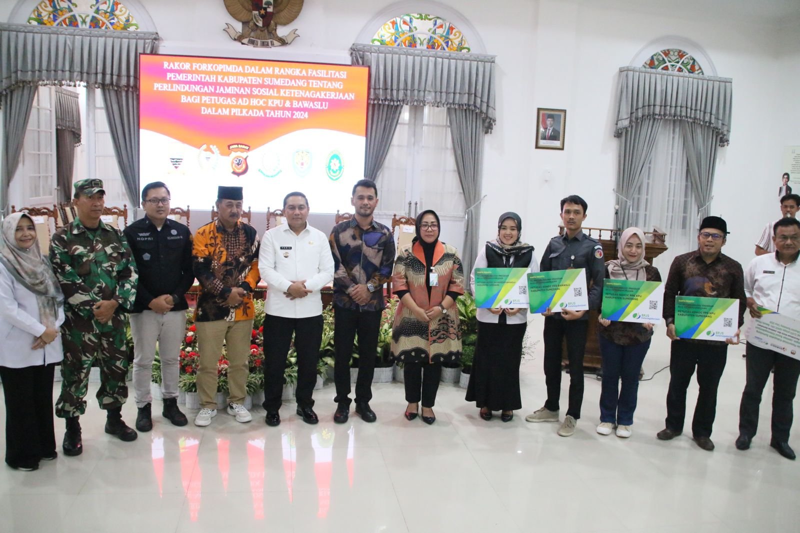 Kartu kepesertaan BPJAMSOSTEK untuk para petugas adhoc KPU dan Bawaslu tersebut secara simbolis diserahkan langsung oleh Penjabat Bupati Sumedang Yudia Ramli didampingi Kepala Kantor BPJS Ketenagakerjaan Sumedang Rita Mariana, Ketua KPU Sumedang Ogi Ahmad Fauzi dan Ketua Bawaslu Sumedang Ade Adrianta Sinulingga dalam Rapat Koordinasi Forkopimda, di Gedung Negara, Sumedang, Rabu, 13 November 2024.