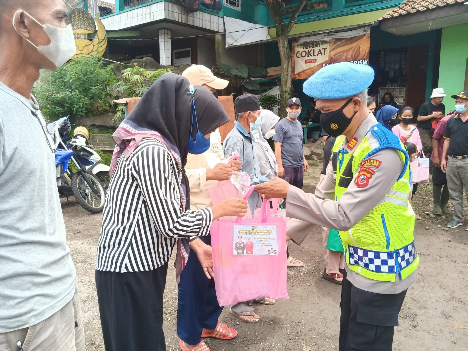 Polres Sumedang memberikan bantuan berupa sembako kepada warga yang terdampak terkena longsoran tanah .