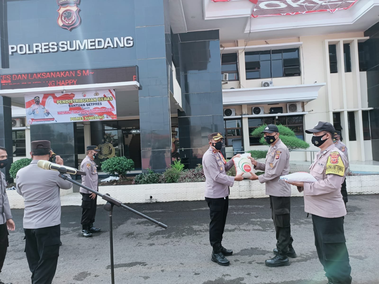 Pendistribusian beras tersebut, diawali dengan kegiatan Apel Pendistribusian Beras Bantuan Setpres kepada masyarakat yang terkena dampak PPKM Level 4 tahun 2021 Polres Sumedang, yang diikuti oleh seluruh Polsek jajaran Polres Sumedang, di Halaman Mapolres Sumedang, Selasa (10/8/2021).