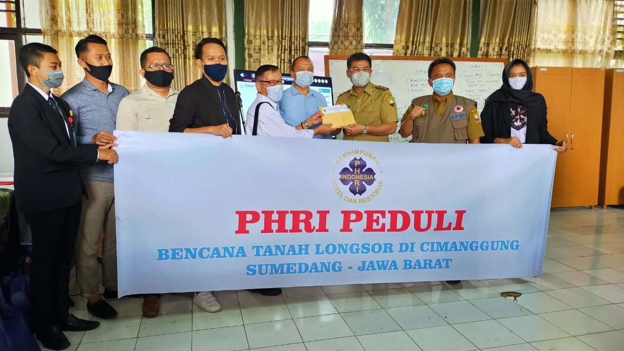 Sumedang, KORSUM – Badan Pengurus Daerah (BPD) Perhimpunan Hotel dan Restoran Indonesia (PHRI) Jawa barat dan BPC PHRI Sumedang menyerahkan donasi bagi korban bencana longsor di Dusun Bojongkondang Desa Cihanjuang Kecamatan Cimanggung, Selasa (19/1/2021).