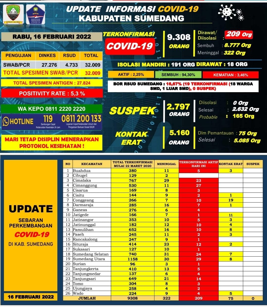 Sumedang, KORSUM.ID – Sangat mengkhawatirkan tingkat perkembangam kasus konfirmasi Covid-19 di Kabupaten Sumedang terus mengalami peningkatan dan hari ini Rabu 16 Februari 2022 ada 40 kasus konfirmasi positif baru.
