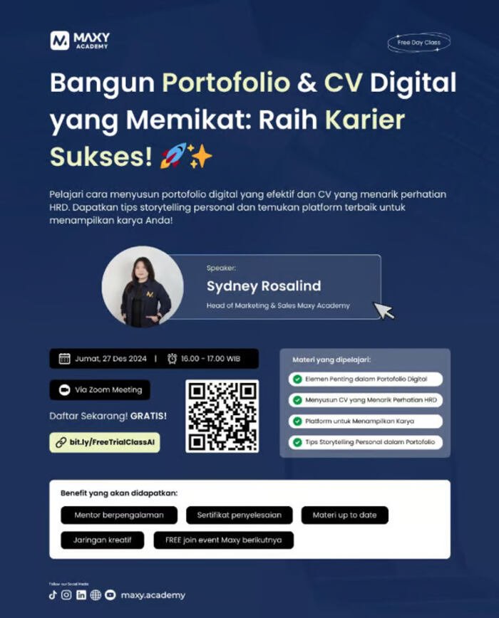 Korsum.id – MAXY Academy kembali menghadirkan Free Day Class, sebuah program edukasi gratis yang ditujukan untuk membantu para profesional muda dan mahasiswa dalam mengembangkan keterampilan karier mereka. Kali ini, tema yang diusung adalah “Crafting Portfolios and CVs for a Digital Career”. Acara yang dilaksanakan secara virtual melalui platform Zoom ini menghadirkan Sydney Rosalind, Marketing Manager di MAXY Academy, sebagai pembicara utama.