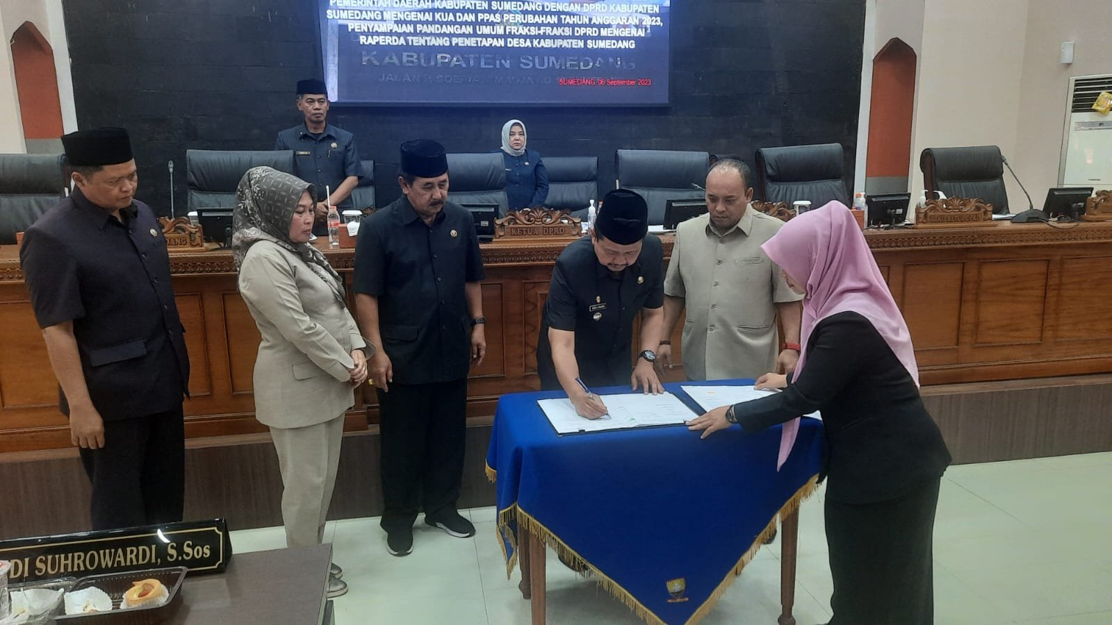 Penandatanganan Nota Kesepakatan tersebut dilaksanakan oleh para Pimpinan DPRD Sumedang yang terdiri dari Ketua DPRD Irwansyah Putra dan para Wakil Ketua DPRD, Titus Diah, H. Sidik Jafar, S.E., dan H. Ilmawan Muhamad, S.Ag., M.M., bersama Bupati Sumedang Dr. H. Dony Ahmad Munir, S.T., M.M., pada Rapat Paripurna pada Rabu (06/09/2023). Rapat dipimpin oleh Ketua DPRD Sumedang Irwansyah Putra.