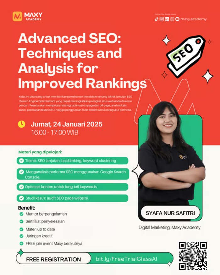 Korsum.id – MAXY Academy sukses menggelar Free Day Class bertajuk Advance SEO. Acara ini menghadirkan Syafa Nur Safitri, seorang SEO Specialist, yang membagikan wawasan mendalam tentang strategi optimasi mesin pencari bagi website.