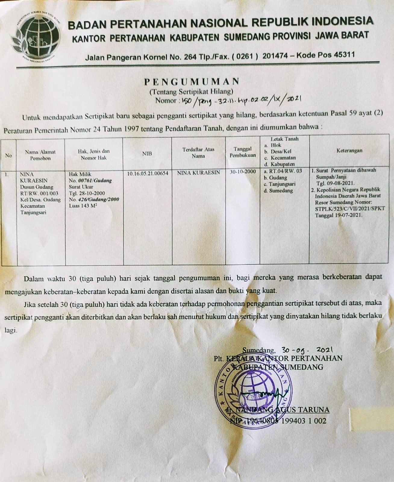 Beranda Ekonomi Pengumuman Sertifikat Hilang Ekonomi Pengumuman Sertifikat HilangMakoOktober 29, 2021Oktober 29, 2021 Komentar
