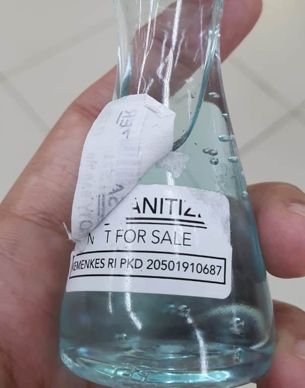 “Ketauannya, tadi ketika saya perhatikan ada dua lable menempel pada sanitizer itu. Setelah dibuka ternyata ada tulisan not for sel Kemenkes RI yang sebelumnya ditutupi oleh lable harga dari toko itu,” kata Feri pada KORSUM, Minggu (29/3).