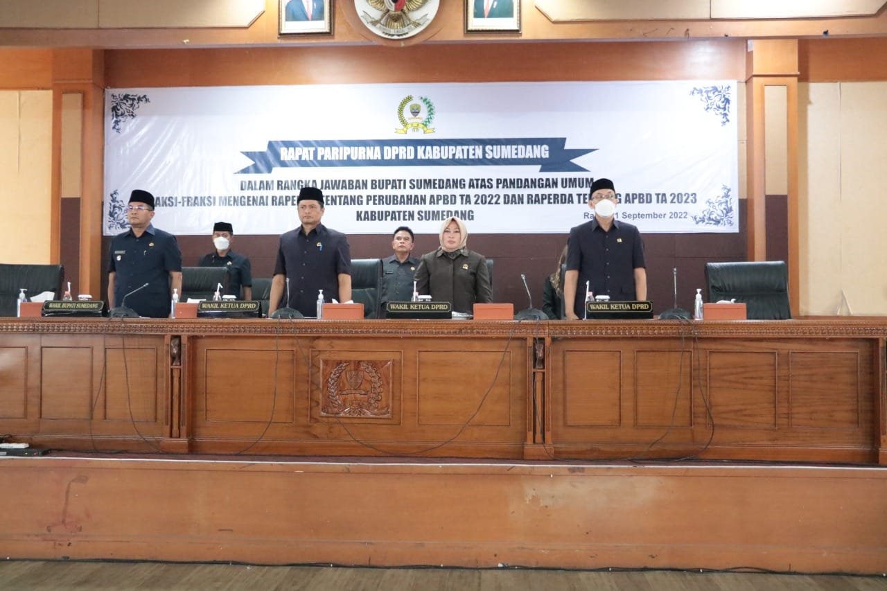 Sumedang, KORSUM.ID — DPRD Kabupaten Sumedang menggelar Rapat Paripurna Penyampaian Jawaban Bupati atas Pandangan Umum Fraksi-fraksi DPRD mengenai Raperda Perubahan APBD 2022 dan APBD 2023, di Aula Tampomas Pusat Pemerintahan Sumedang, Rabu (21/9/2022).