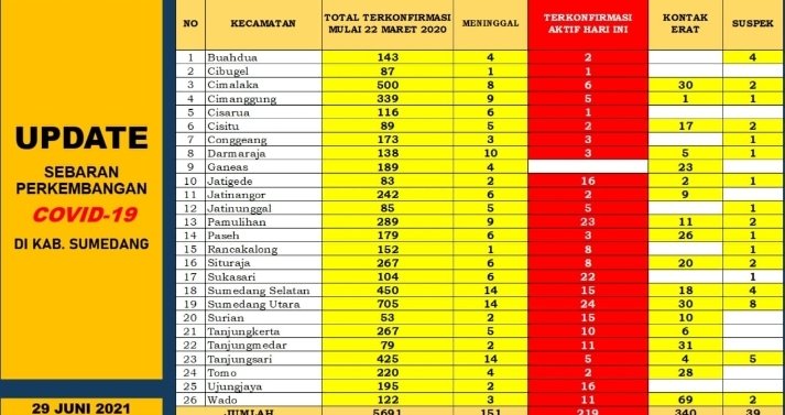 Sumedang, KORSUM – Kasus Covid-19 di Kabupaten Sumedang meningkat tajam pada hari ini. Berdasarkan data dari Satgas Penanganan Covid-19 Sumedang terdapat penambahan kasus 122 kasus baru yang tersebar di 16 Kecamatan pada Selasa 29 Juni 2021 ini.